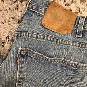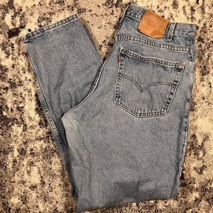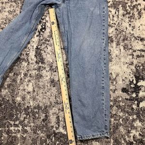 These are high-quality vintage 90s Levi’s 560 light wash denim jeans. Good condition, leather patch fading.