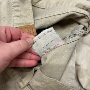 Vintage 90s 1999s Levis Red Tab 501XX Tan Men's Size 33 Button Fly Cotton Jeans made in USA straight leg pockets lightweight, have been hemmed and sewn, stained on front and back