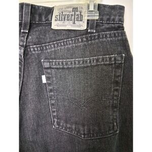 This product is a pair of Vintage 90s Levi's Silver Tab Straight Jeans in black, size 32x31. These jeans feature a mid-rise and a straight leg fit, with a zip and button closure, and a 5-pocket design. Made of denim fabric, they have a dark wash and are machine washable. The design includes the Levi's Silver Tab logo as accents, and the style is suitable for various seasons like winter, summer, fall, and spring. These jeans also showcase themes of grunge, metal, and 90s fashion, and are a part of the Levi's Silvertab product line.