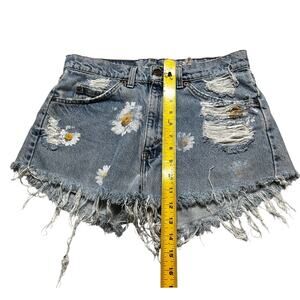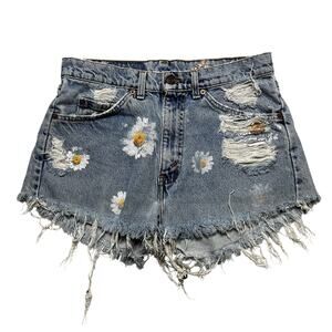 LF Furst of a Kind Hand-Distressed / Painted Highwaisted Denim Shorts made from vintage LEVI’S Brand lightwash Custom, one of a kind Daisy ripped denim shorts