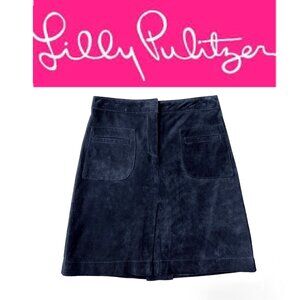 Elevate your wardrobe with this Lilly Pulitzer 100% pig suede skirt in a timeless navy hue. Featuring a flattering A-line silhouette and front patch pockets, this luxurious piece is perfect for adding texture and sophistication to your fall and winter outfits. The soft suede and versatile design make it a staple for any chic wardrobe.