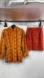 Vintage 80’s 90’s Linda Allard for Ellen Tracy lined orange and red Aztec print 100% silk skirt suit / blazer. Elastic in the waist for a more fitted look. Shoulder pads and decorative epaulets. There is also a functional button underneath the collar and a button at the waist for front closure. Extra button sewn on inside of you lose one. Two faux pockets on the front. The skirt has pockets and belt loops. Side zip, button and 2 clip closure one clip modding other half. Perfect for someone who would like to make a statement, attending an art gallery or has a bold unique sense of style!