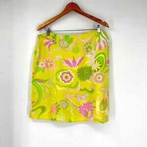 Vintage 90s Linen Blend Retro Floral Psychedelic Skirt Yellow Size 14