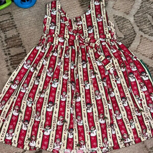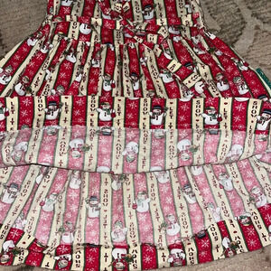 Adorable hand made little girls holiday or Christmas dress with snowman "let it go" pattern and tie behind style.