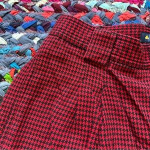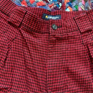 Vintage 90s Lizsport red and black pleated high waist houndstooth shorts. 100% cotton, material feels like a knit. Zip fly, belt loops, slash pockets in front, 1 back pocket with button closure.