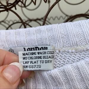 Vintage 90s London Fog knit stripe sweater. Abstract geometric shapes make up the colorful stripes over a white sweater.