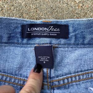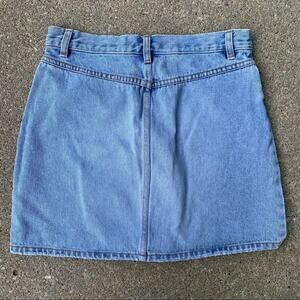 Vintage 90s London Jean button front denim jean skirt. Back back with no pockets and v yoke for snug fit.