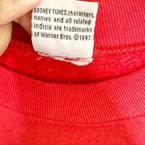 Adorable and comfy red vintage Looney Tunes holiday sweater. Does have a few marks and runs (all pictured) but these are barely noticeable and overall it’s in good used condition. No size tag but would best fit a size large to XL. See posted measurements for more details. All measurements were taken laying flat and are approximate.