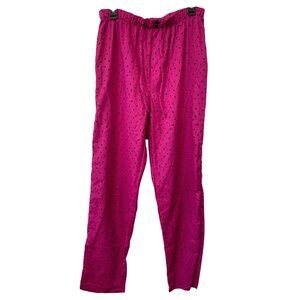 Comfortable fuchsia pants featuring black triangle print. Lightweight blend of polyester and rayon. Elastic waist with button closure. Quality-made in the USA.