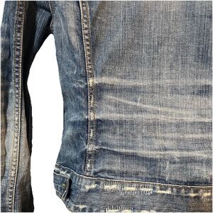 * Medium-wash 100% cotton denim with intentional distressing/fade