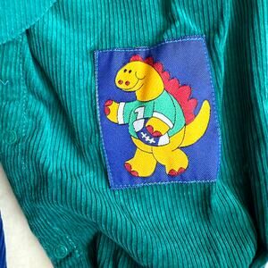 This set is visually attractive and color theory matching, utilizing bold color blocking in deep Royal Blue and Teal Green corduroy that epitomizes the best of 90s style. The white shirt features an energetic all-over Dinosaur Print accented with stars and footballs. The overalls are further detailed with fun embroidered Dino patches (one carrying a football), while bright red and yellow accents on the straps, buttons, and cuffs tie the vibrant look together. A matching corduroy cap completes the ensemble.