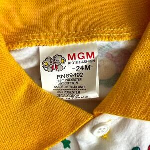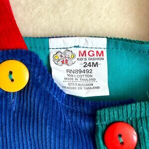 This fantastic vintage 90s MGM Kid's Fashion outfit is an eye-catching 3-Piece Set. This rugged, patch-covered ensemble is perfect for a toddler boy, featuring a long-sleeve patterned shirt, striking corduroy overalls, and a matching cap.