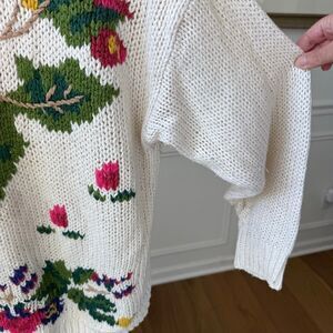 Vintage 90s MJ Carroll floral intarsia knit sweater. Ramie and acrylic blend. Ivory background of green, brown, fuchsia, pink, cranberry, violet, golden yellow. tax size medium. Laying flat measures 26 inches shoulder to him and 25 inches armpit to armpit. Made in Korea.