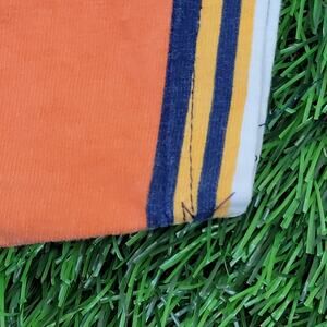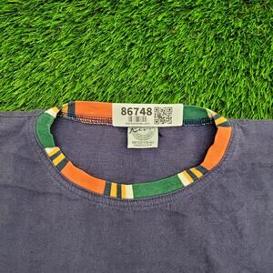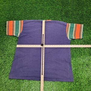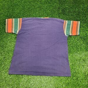 Bold and vibrant 90s mod tee with sun-faded Blue body and striped sleeves, made in USA. Rare find for collectors!