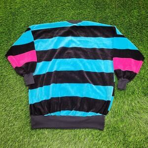 #Vintage90s, #MODStripes, #BaggySweater, #WomensSmall, #RetroFashion, #BlueBlackPink, #VintageClothing, #USAMade, #23x26Sweater, #ColorblockStyle