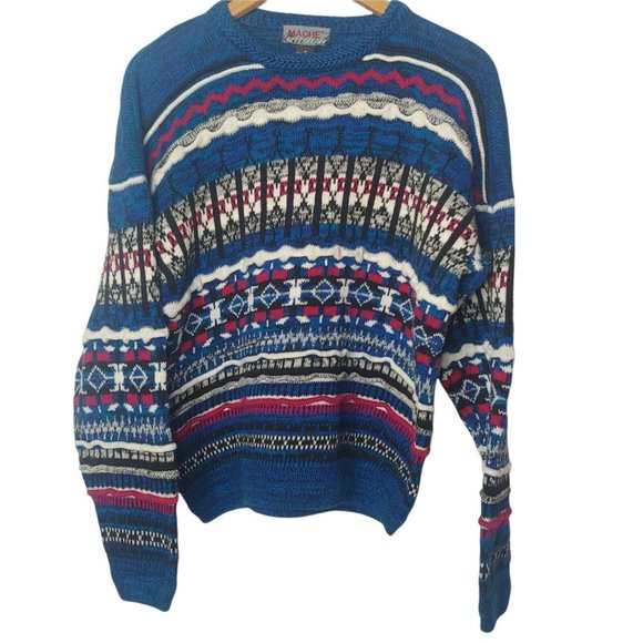 Vintage 90s Mache Men M Oversized Sweater Pullover Textured Knit Geometric Blue
