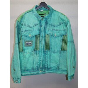 The 90s Major Damage Men's XL Turquoise Denim Jacket is a vintage streetwear piece with a unique geometric print. Made of cotton denim, this bomber jacket features a collared neckline, button closure, and pockets for added style and functionality. Perfect for casual occasions like parties or travel, this jacket is a standout piece with a retro 90s vibe, ideal for fans of hipster, grunge, and outdoor aesthetics. Its short length and regular fit make it a comfortable and stylish addition to any wardrobe.