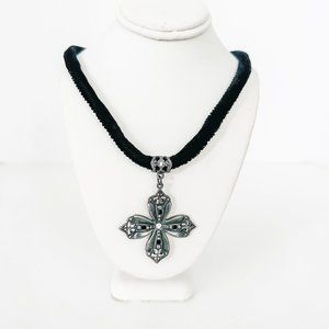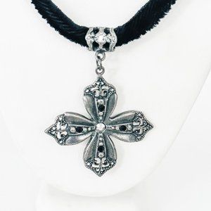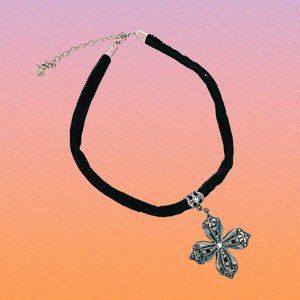 This necklace is a velvet choker with a metal/marcasite cross. From my own early 90's closet.