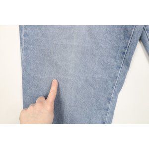 Blemishes front and back. Inseam hemmed. Cuffs distressed/frayed. Distressed and faded. USA made. Button Fly