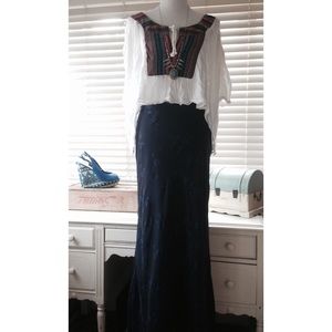More pics to come. This bohemian maxi skirt is full of glimmer and perfect for summer! Easily dressed up with an elegant blouse. Wear with a flowy top, crop top, or cami for a casual, fun look. The sheer top layer is indigo and features a sparkly pop of blue floral print all over. The liner is solid black. Some of the sparkles have fallen off, but not noticeably. Overall, it's in nice condition. Made in USA. Size L. Make an offer if you're interested. Feel free to ask any questions. 😎✌🏻️💜