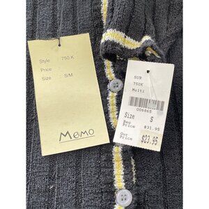 This MeMo cardigan features a ribbed knit texture with a button-up front, striped collar and sleeve accents in yellow and white, and a comfortable short sleeve design.