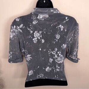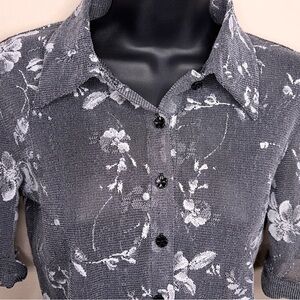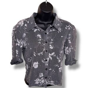 Vintage 90s Medium Eyeshadow Grey White Floral Stretch Top Button Up Half Sleeve