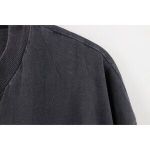Collar stretched. Blemishes shoulders, collar/inner collar, back top. Dark spots, pilling. Collar, arms discolored. Graphics cracking/faded. Made in USA