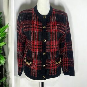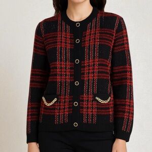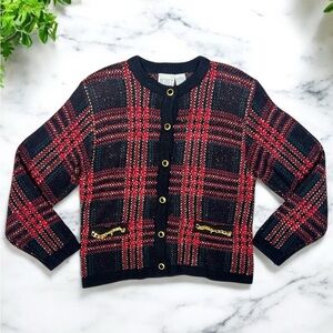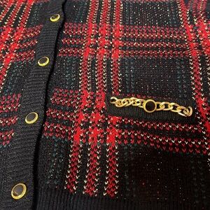 Vintage, 90s • Metallic Weave Old Money Preppy Plaid Knit Button Up Cardigan Sweater w gold chain embellishments, lightly padded shoulders.