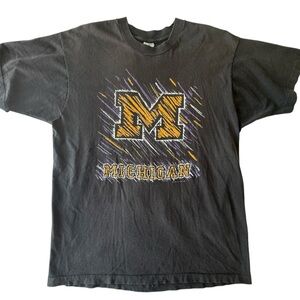 Black Vintage 1990s Michigan Wolverines College Football T-Shirt. USA Made, Single Stitch. Please refer to photos for condition. Few small holes on the shirt. Two on front bottom of Shirt and two on the back of the Shirt, one at bottom and one at the top by the shoulder. Overall good condition.