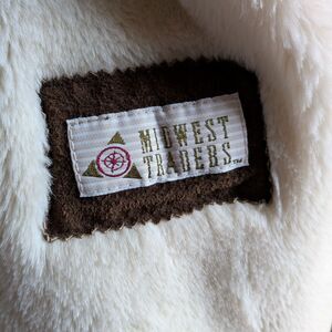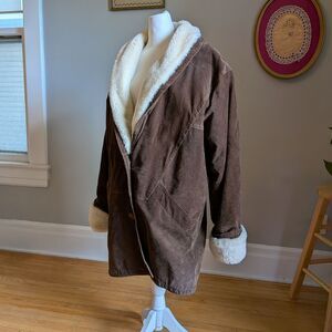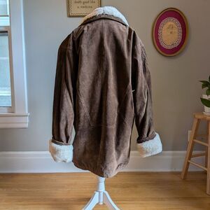 Vintage 1980s/1990s Midwest Traders brown suede jacket/chore coat. Faux Sherpa lining, visible on sleeve cuffs and neckline. Button front. Pockets. Coat is in good vintage condition with light wear to suede and discolroation on Sherpa cuffs and neckline. Please see photos. I believe the marking on the cuff can be removed.
