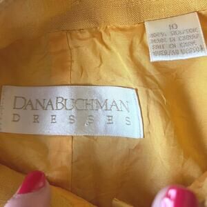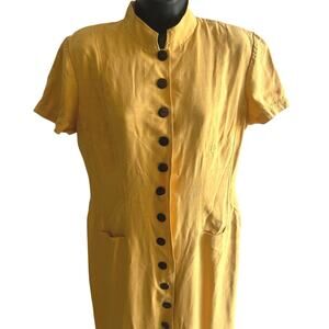 Step into timeless elegance with this authentic vintage Dana Buchman silk dress from the 1990s. Crafted from 100% silk, this piece showcases the era's minimalist design sensibility with a sleek silhouette, structured fit, and striking mandarin collar. The bold mustard yellow tone adds a statement pop of color, while the full front button closure and short sleeves keep the look polished yet versatile.