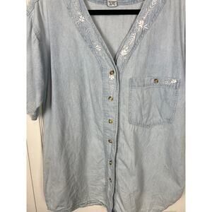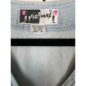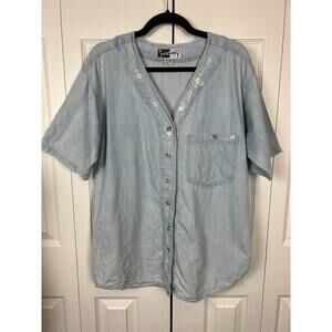 Vintage 90s Miramax Chambray Denim Sort Sleeve Button Top Embroidered Medium