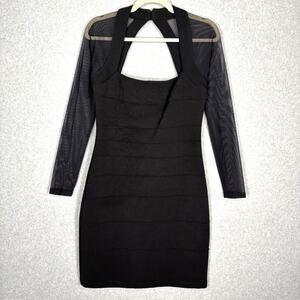 Vintage 90s Moda International Dress Medium Black Bondage Mesh Sheer Long Sleeve Tight Fitted Party Mini Halter Stretch Cocktail Holiday Christmas Goth Rock Cutout Square Neck Sexy