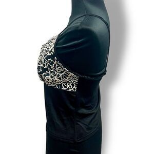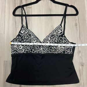 Vintage 90’s Moda International embroidered cami in white and black sz L. Super sexy. Stretchy. Worn once. Has been in storage since the 90’s. Perfect for day to night. STRAPS ARE SHOWING SIGNS OF AGE/ELASTICITY COMPROMISE. Can sew on new straps or re sew current straps. Cups are fully lined as shown. Slip on style. Measurements in photos.