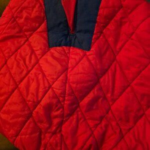 Clean - great condition. Clean lining and outer.. No rips or stains. Large. Pretty puffy/thick. Not a flimsy single layer nylon windbreaker or something.Half zip - has fabric behind the zipper when it's unzipped. Also has a side zip on the right side.