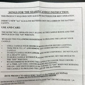 Music will operate only as long as the candle burns and the switch is in the “on” position.