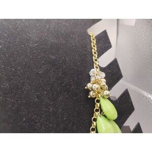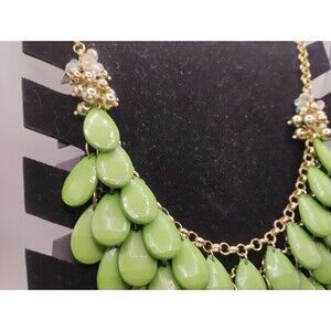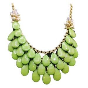 This woman's necklace features a teardrop-shaped bib pendant with green acrylic beads, making a statement piece. The necklace is 21 inches long and has a lobster closure. It has a vintage style and is made of stainless steel. The brand is Francescas, and it is new with tags. Perfect for occasions like Mother's Day, weddings, birthdays, and more, this necklace adds a touch of elegance to any outfit.