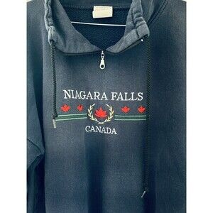 Embrace the nostalgia of the '90s with this vintage Niagara Falls Canada souvenir sweatshirt. Featuring a classic henley tie neck design, this piece is a testament to the era's love for unique travel memorabilia. The navy cotton fabric provides a comfortable fit, making it a perfect addition to your casual wardrobe. It has a great work in feel making it soft and cozy.