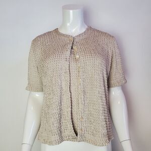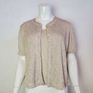 Vintage 90s Nicole Studio tan textured crew-neck short-sleeved button-front cardigan with built-in non-detachable tank top.
