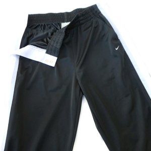 Vintage 90s Nike Black Snap Tear Away Track Pants. Stripe White Grey. Front & Pack Pockets. N I K E Snap Spell outs. Snap Full Sides from Waistband down to Hem. Machine Washable Poly. Made in Philippines. Tagged Size XL 16