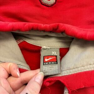 Vintage 90s Nike Ohio State University OSU Red Grey Mens XL Pullover Hoodie Swoosh logo, sporty athleisure Ohio State Chest and hood Spellout with kangaroo pockets swoosh with minimal stains on it, tear present