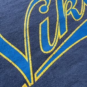 • Vintage 90s simple essential Nike Varsity script letter spellout and swoosh graphic print logo t-shirt in a really cool faded dark blue color with blue and yellow graphic on a 90s Nike white tag. Vintage 90s, Nike, sportswear, streetwear, hype, essential, sporty, relaxation, casual vibes.