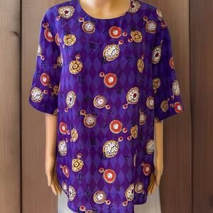 Vintage 90s Notations Top Blouse Women Plus20W Purple Old ClockPrint Retro Oldie