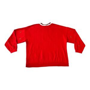 Get ready for the holiday season with this vintage 1992 Nut Cracker brand Christmas sweatshirt! This red pullover with a mock neck and long sleeves features festive glitter accents and graphics, perfect for any Christmas occasion. Made of machine washable acrylic fabric, this sweatshirt is a size M and has a regular fit.