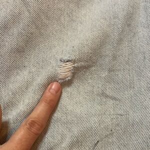 Super well worn and distressed. Holes and stains everywhere. Modeled on a woman with a 30” waist for reference.