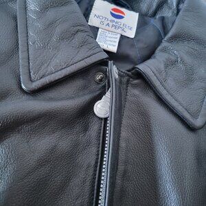 Vintage 90’s PEPSI Men’s L Classic Black Leather Bomber Jacket, Lined and Insulated, Very Warm & Heavy, Zip Closure with Leather Button Flap, PEPSI Logo on Buttons and Zipper Pull, Adjustable Cuff’s, Side Pockets, Inside Pocket, This Jacket has never been worn, NWOT.
