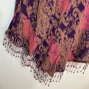 Add boho charm to your wardrobe with this PHOOL Pink/Purple Paisley Beaded Hem Blouse & Skirt Set in size Large. Featuring a vibrant paisley print and intricate beaded detailing along the hems, this set blends elegance with a free-spirited vibe. The lightweight fabric and flowy silhouette make it perfect for warm weather or special occasions. Please note, the top of this set has a small snag on the front—see pictures for details. A unique and eye-catching ensemble that’s both comfortable and stylish.