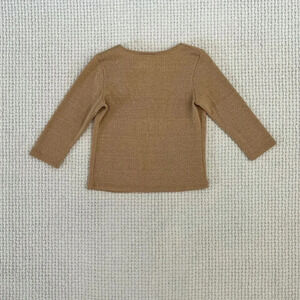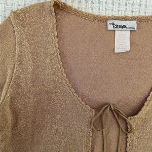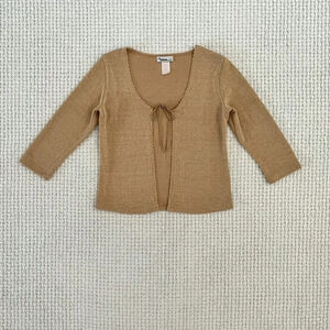 “hot papaya clothing” tan tie front cardigan with a gold sheen and scalloped inner hem