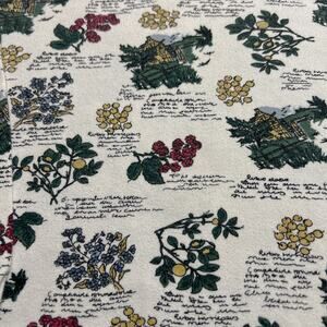 White long sleeve with all over art print of flowers and houses with cursive text. Turtle neck, long sleeve, pullover style. Vintage 1990s.