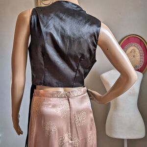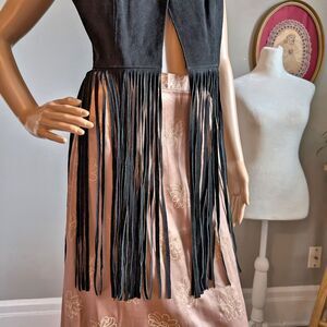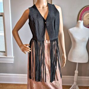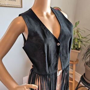 Vintage 1990s Passports black suede vest. Front of vest is leather/suede material with long fringe. Back is fabric. Button front. Vest is in good vintage condition with some light wear to suede. Please see photos.
